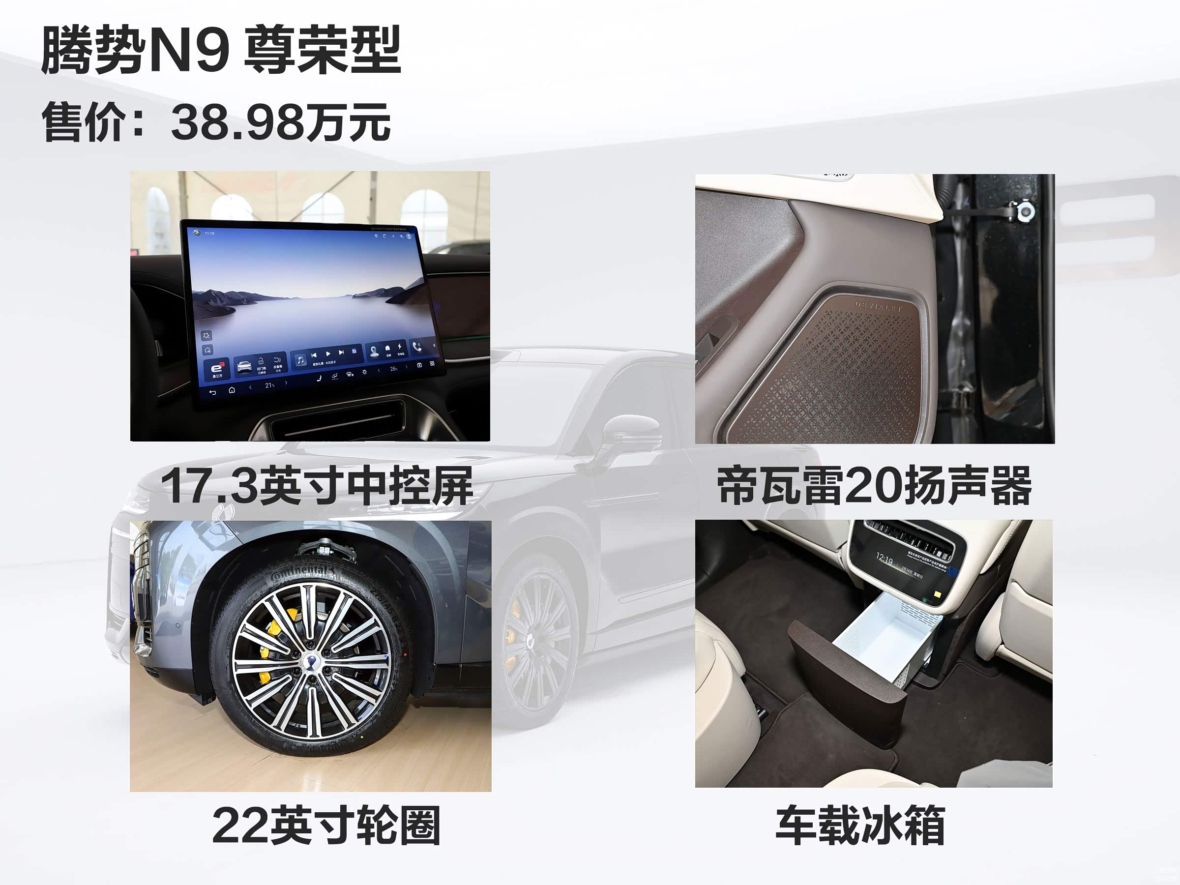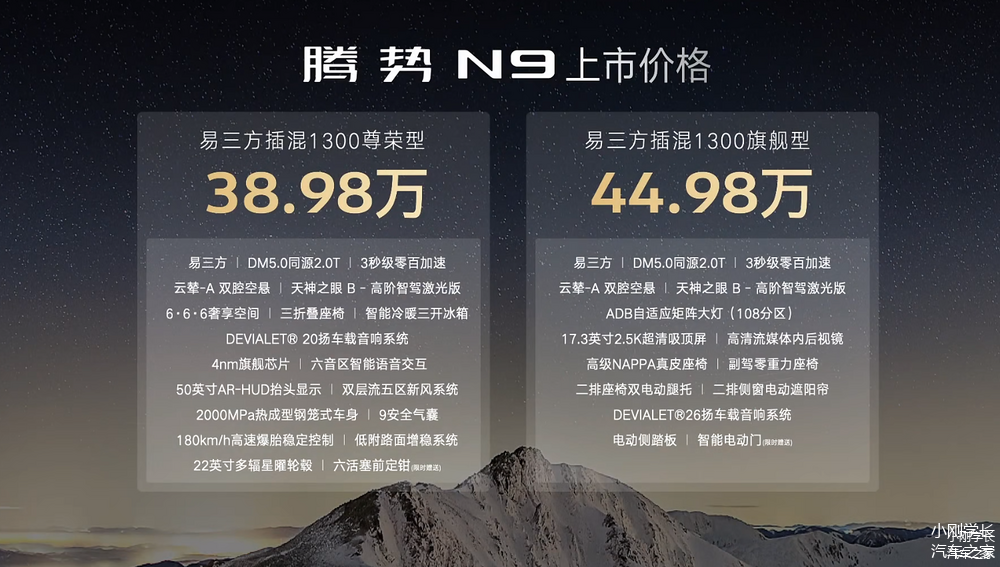 腾势N9目前只有两个版本,售价38.98万元的尊荣型和44.98万元的旗舰型,选择比较容易,标配配置上腾势N9提供易三方、天神之眼-B辅助驾驶、云辇-A 双腔空悬、智能冷暖三开冰箱、DEVIALET 20扬声器车载音响系统、六音区智能语音交互、50英寸AR-HUD抬头显示、19安全气囊、22英寸多辐星轮毂等。