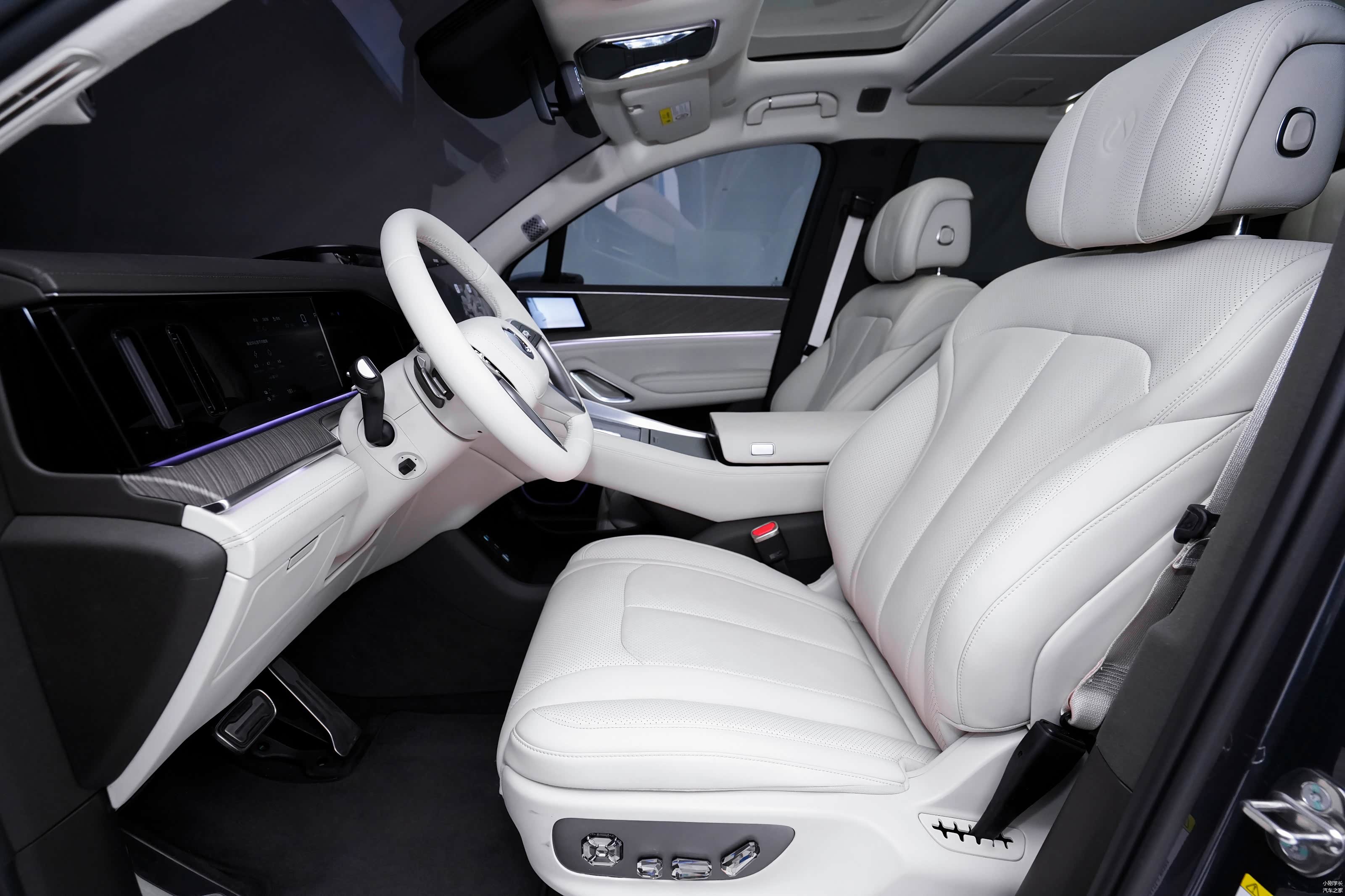 内饰采用双拼色配搭,铂檀灰和云锦米两种配色可选,中控增加了饰板装饰,采用大面积软质包覆。配备四幅电容方向盘、17.3英寸中控屏、13.2英寸全液晶仪表和13.2英寸副驾娱乐屏组成的三屏显示,搭载 50英寸AR-HUD、主动香氛系统、主动式氛围灯,同时部分车型还提供电子外后视镜选装,顶配车型提供26扬帝瓦雷翻转扬声塔+同级唯一双头枕音响。
