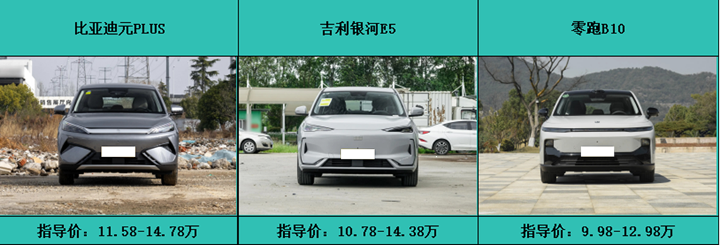 首先,虽然三款车同为10-15万价位车型,但价格差距还是有的,而我们消费者在买车时首先都会考虑价格因素,因此,我们先来对比三款车型的价格。比亚迪元PLUS指导价:11.58-14.78万;吉利银河E5指导价:10.78-14.38万;零跑B10指导价:9.98-12.98万。经对比后不难看出,零跑B10在价格方面的优势是要高于比亚迪元PLUS和吉利银河E5的。