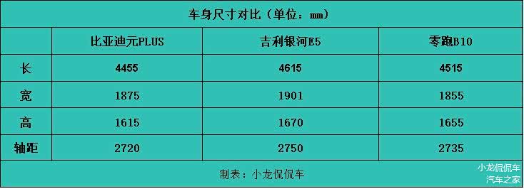 作为家用车型,空间也是比较重要的,具体三款车型的长宽高以及轴距数据如上表。对比三车具体车身尺寸可直观看出吉利银河E5和零跑B10的优势要高于比亚迪元PLUS,此外,决定车内空间大小的因素还与合理的设计有关,吉利银河E5虽然车身尺寸比零跑B10略大,但“得房率”不及零跑B10,零跑B10拥有87.4%的“得房率”。