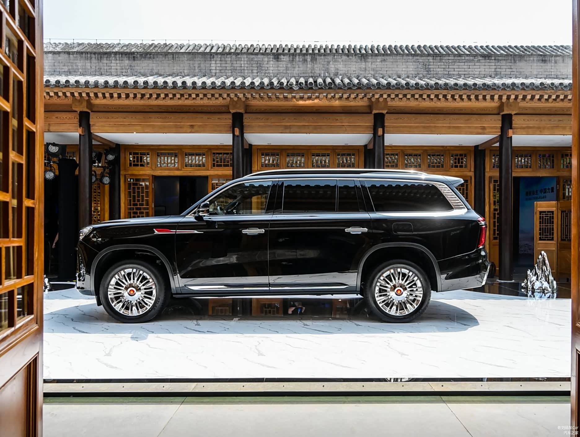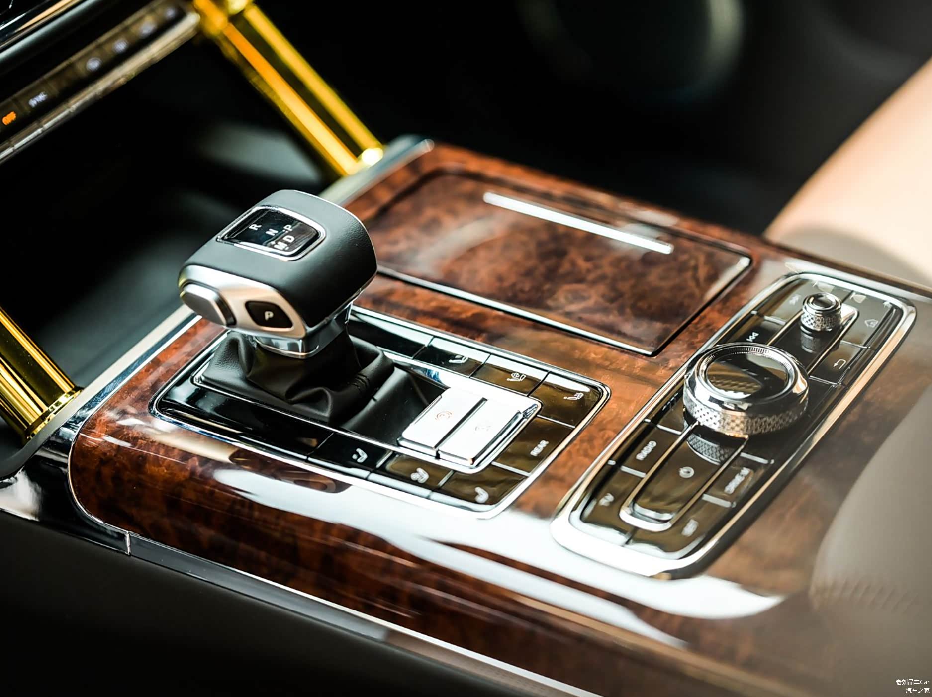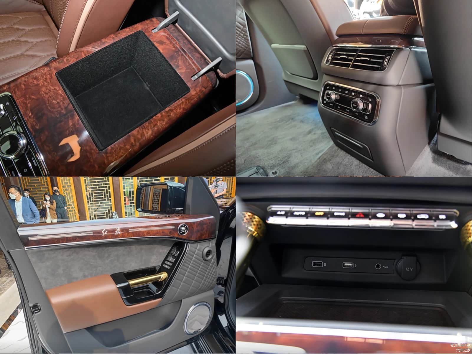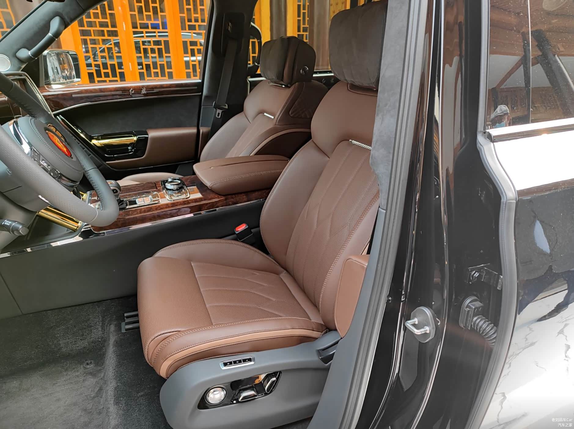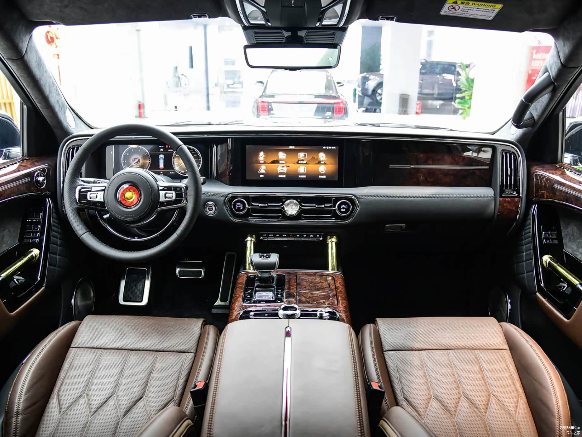 座椅采用真皮材质包覆,摸上去非常有质感,电动调节、加热、通风、按摩、记忆等功能一应俱全。中控台使用完全对称的中轴设计,前面以及门板上都有金色扶手,全是用纯黄铜材质打造,上面还有寓意祈福的压花装饰。车内配备了253色的氛围灯、14个扬声器,扬声器上有层峦叠嶂的感觉图案,非常有韵味。中控台上搭载一块12.3英寸液晶仪表和一块相同尺寸的中控大屏,很有科技感。车机里面有加密的芯片,避免里面重要的信息泄露。辅助驾驶配置给得很丰富,全系支持360°全景影像、定速巡航、自动驻车等功能。