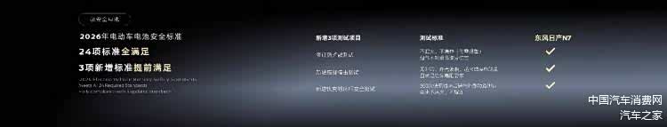 其中,N7的超安全笼式车身,成功挑战行业首个巴音布鲁克翻滚挑战。搭载行业首个四针刺多电芯无热蔓延超安全电池,历经146项超高标准电池保障测试。根据2026年的新国标,N7的电池不仅24项标准测试全部达标,更提前满足了热扩散、底部撞击、快充循环后安全测试3项新增标准!