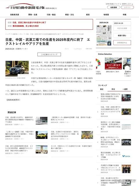日前,据《日刊自动车新闻》报道,日产汽车计划在2026年3月31日停止其中国武汉工厂的汽车生产。这一决策与该工厂在激烈的市场竞争中产能利用率持续下滑有关所导致。
