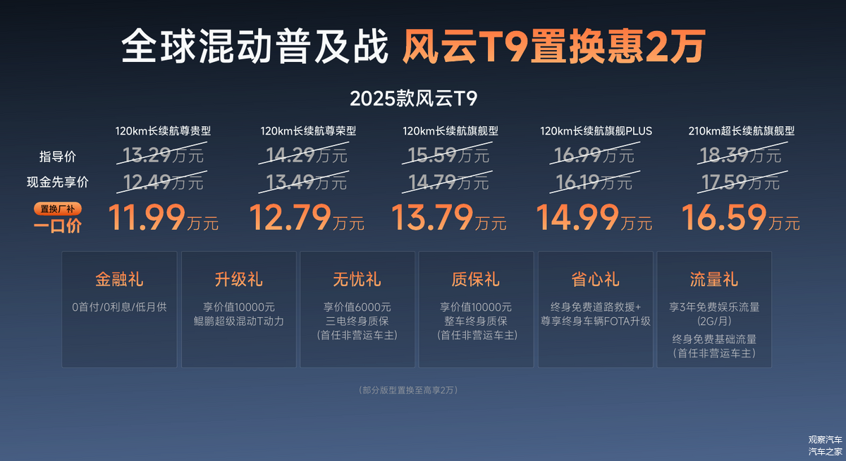 最后,还要放出风云T9混动之夜上的最大“惊喜包”——置换厂补一口价11.99万元起!此外,奇瑞风云还会放送别的超值好礼,从终身质保到免费流量,从0首付金融方案到鲲鹏T动力升级大礼包,应有尽有!用合资中配的价格,给你豪华顶配的体验。面对它,你唯一的难题可能是:今天下订选哪个颜色?