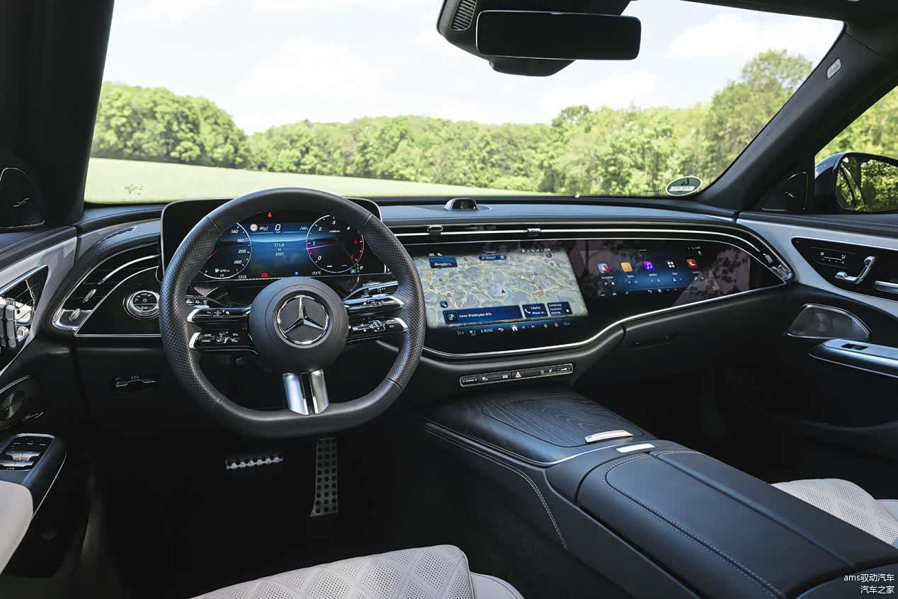 当然,对熟悉奔驰E级车的老用户来说,它的操作便利性也没好到哪儿去,尤其是还得在双辐式方向盘的辐条周围进行触摸操作。不过,你可以静下心来好好打量一下这个包覆着绒面皮革的豪华驾乘空间!那富有雕塑感的仪表板巧妙地集成了三块显示屏,而且车内各处都布置了彩色的装饰元素。可进行多种配置的显示内容会以3D动画的形式跃入眼帘,而前挡风玻璃上的平视显示系统能虚拟呈现出整个行车道的情况,副驾驶的乘客在车辆行驶时还能观看YouTube视频呢。