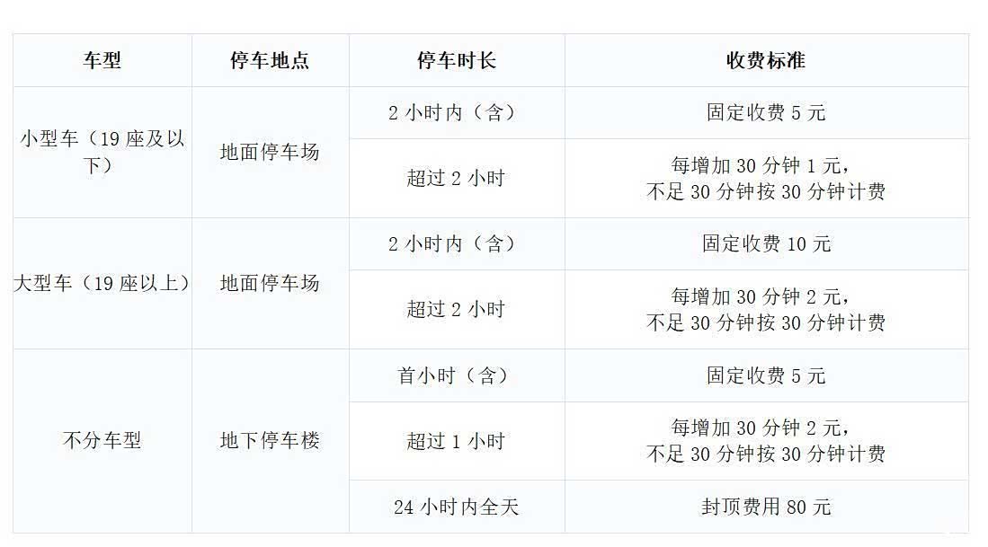 车辆停放在地面停车场,前两小时收费5元。之后每多停30分钟(不足30分钟按30分钟计),增收1元。同样,24小时内停车费用最高限定为80元。