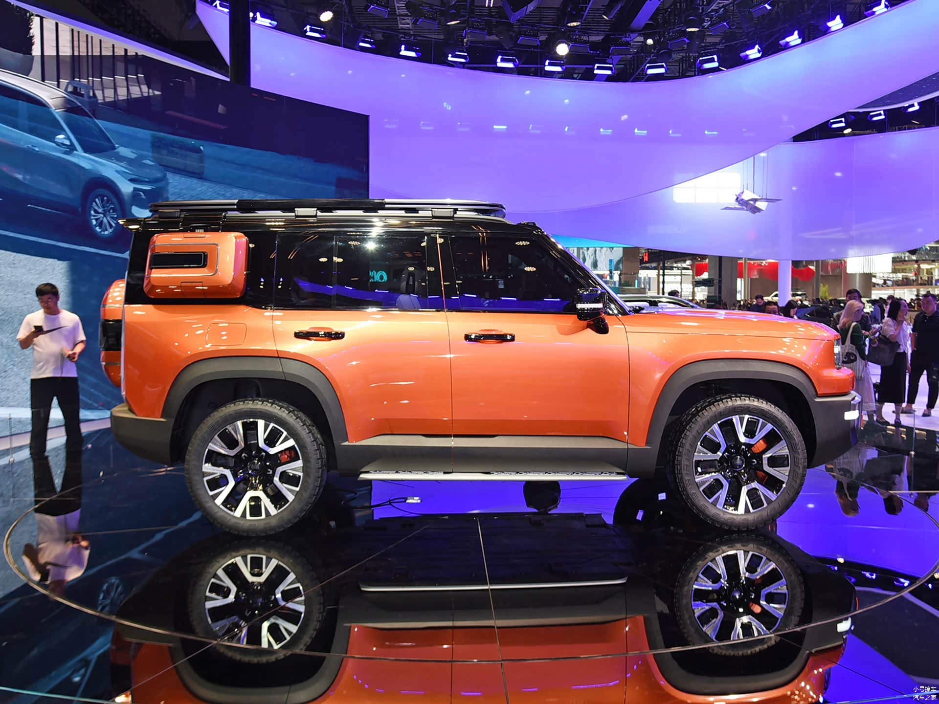 侧面造型方面,车身线条比较方正,车顶配备有粗壮的行李架,有着比较强的力量感;双色车身还营造出了悬浮式车顶,属于目前非常流行的设计语言;腰线采用的是分段式设计,点缀出了车身侧面的层次感;轮眉和侧裙部分设计有粗壮的黑色饰板,进一步增强了力量感。轮毂采用了多幅式造型,风格还算大气。