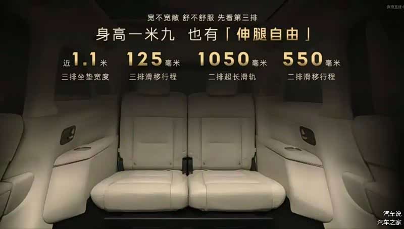 例如,采用的2+2+2的座椅布局,二排座椅支持550mm长滑轨移动,三排座椅支持125mm前后调节,前两排座椅都提供了加热、通风、按摩功能,第三排也提供了加热和按摩功能,而竞品车型上,大多第三排只提供加热功能。