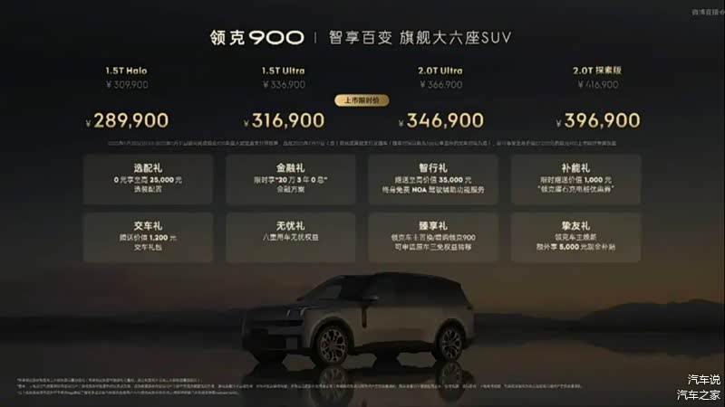而且从领克900 1.5TUltra版开始,就配备了空气悬架,具备了魔毯悬挂的功能,还可以享受25000元的限时选装件赠送的权益,包含了价值10000元的电动踏板、价值10000元的31喇叭哈曼卡顿的音响,以及价值5000元的前脸贯穿式科技交互屏,而且这个交互屏还可以享受厂家提供的三年“交互屏守护”服务。