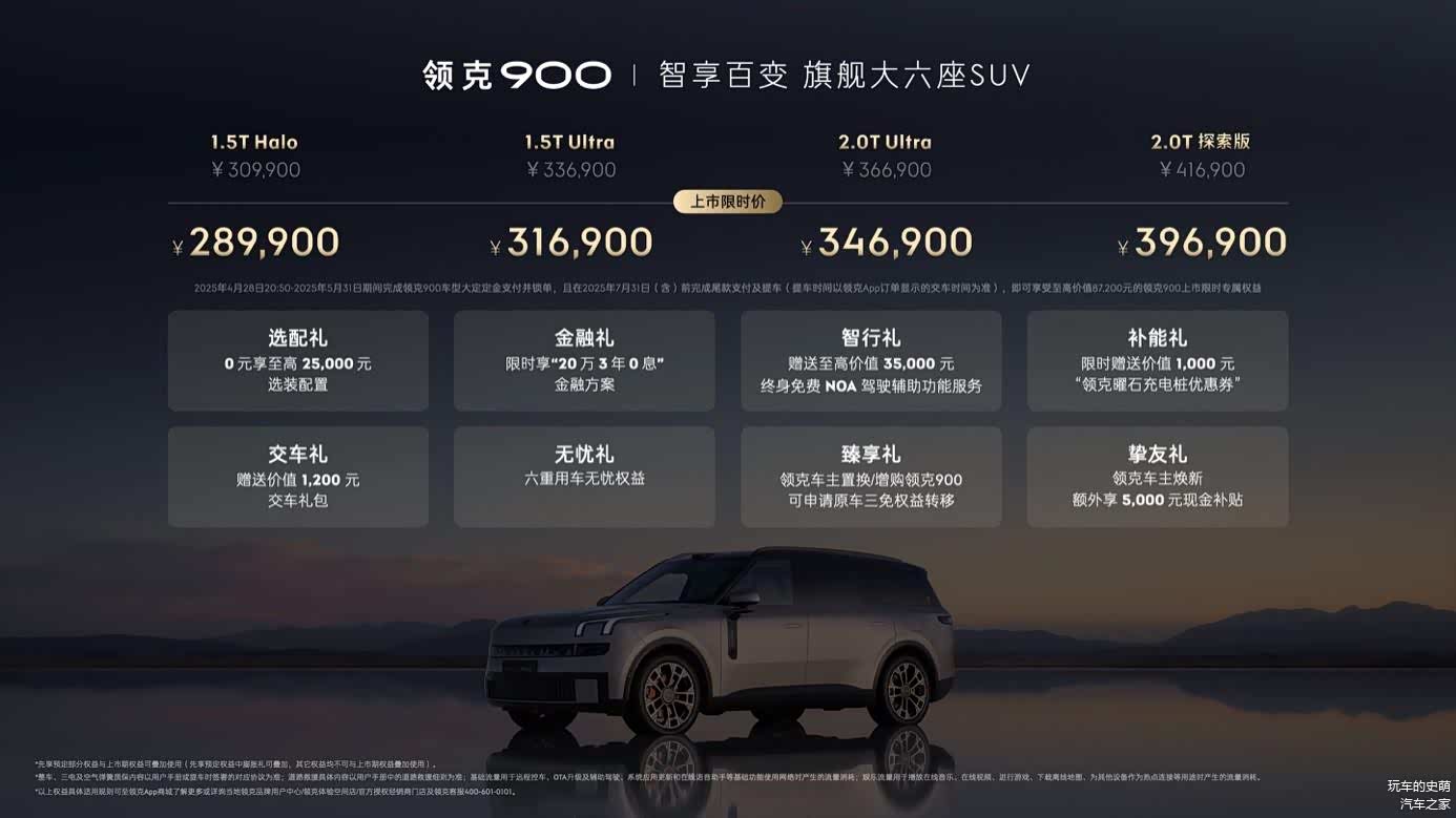 2025年4月28日,领克汽车旗下全新旗舰力作 领克900(图片 | 参数 | 询价)正式上市,推出1.5T Halo、1.5T Ultra、2.0T Ultra 、2.0T探索版四大配置,限时售价28.99万元至39.69万元。