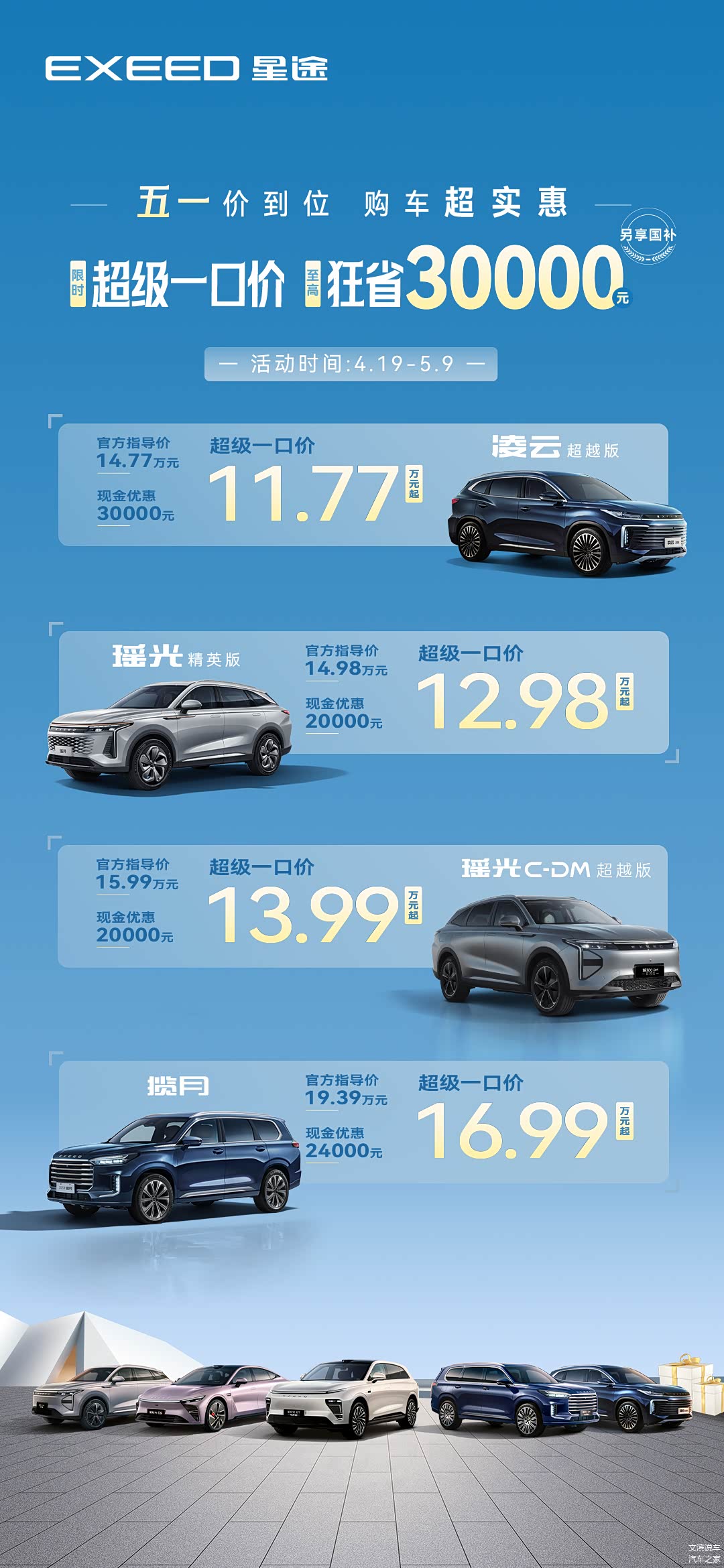 为满足用户的多样化购车需求,星途汽车同期还推出“五一价到位 购车超实惠” 限时一口价活动。即日起至2025年5月9日用户选购凌云超越版、瑶光精英版、瑶光C-DM超越版以及2025款揽月等车型,最高可省30000元(另享国补)。其中,凌云超越版现金优惠30000元,超级一口价11.77万元起;瑶光精英版现金优惠20000元,超级一口价12.98万元起;瑶光C-DM超越版现金优惠20000元,超级一口价13.99万元起;2025款揽月现金优惠24000元,限时超级一口价16.99万元起。质价比进一步拉满!