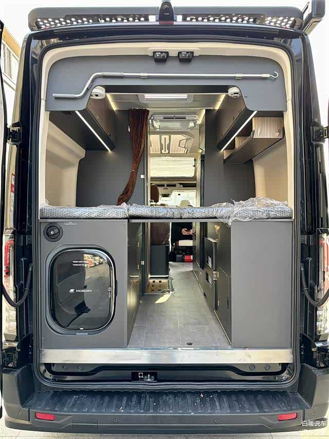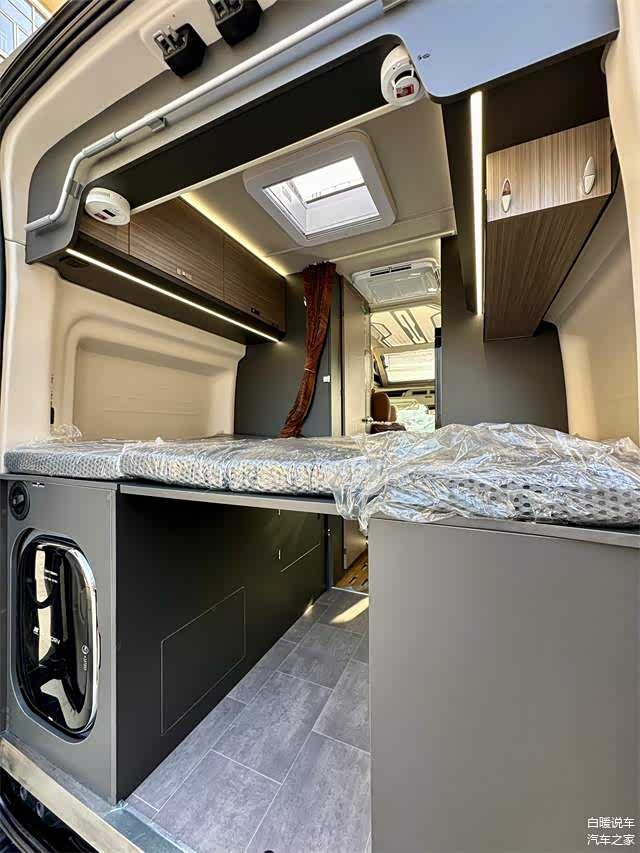 • 卧室区域:尾部配有横置大床铺,尺寸达到2.05m×1.3m,可满足两人休息需求。床顶配备带氛围灯双向通风换气扇,床下一侧内嵌一台3kg带烘干功能的洗衣机。