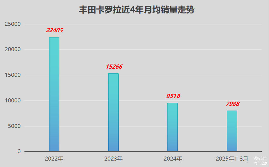 咱就以 丰田卡罗拉(图片 | 参数 | 询价)为例,我计算了最近4年时间卡罗拉的月均销量,做成了下面这张图表,很明显,这几年,卡罗拉的月均销量在一路下滑,从2022年的月均2.2万台销量,到2025年前三个月的月均7988台销量,跌没了三分之二!