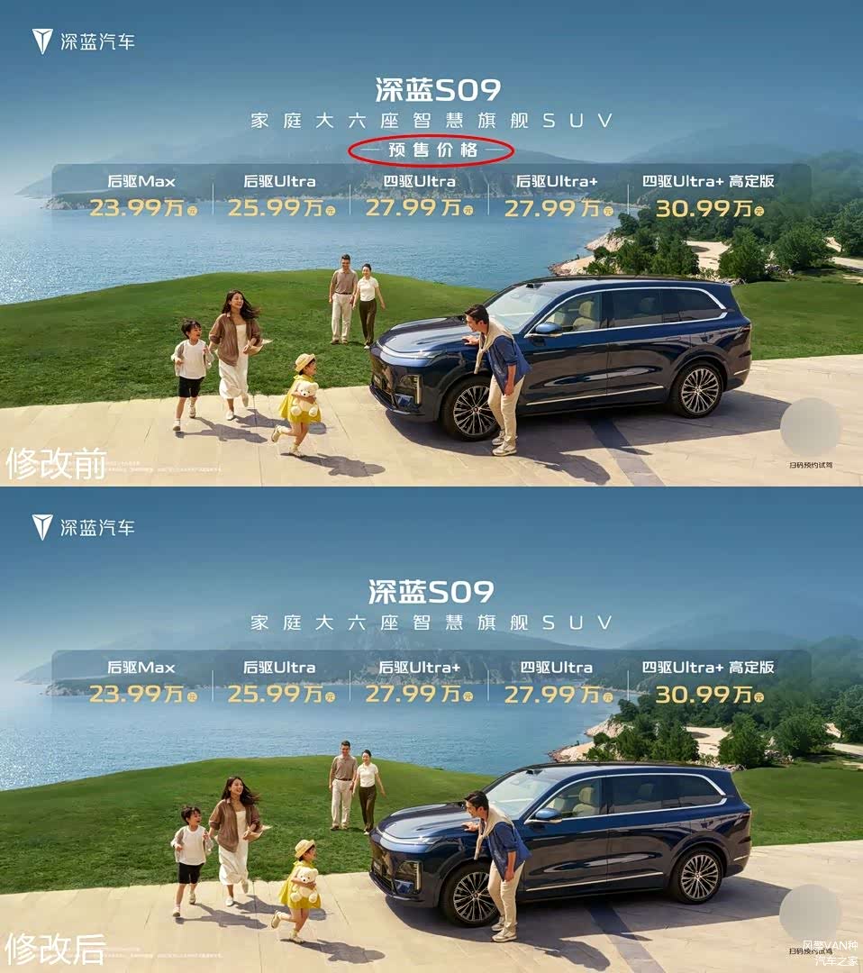 一、深蓝S09预售发布会价格让人误解。在4月23日的预售发布会上,深蓝汽车公布了深蓝S09的预售价区间为23.99-30.99万元。或许是预售价公布之后市场反响超出预期,也或许是宣传组的工作失误,深蓝汽车在车展当天下午悄悄将深蓝S09宣发海报中的“预售价格”四个字删掉了,同时部分门店的一线销售也被告知23.99-30.99万元就是深蓝S09的正式指导价。