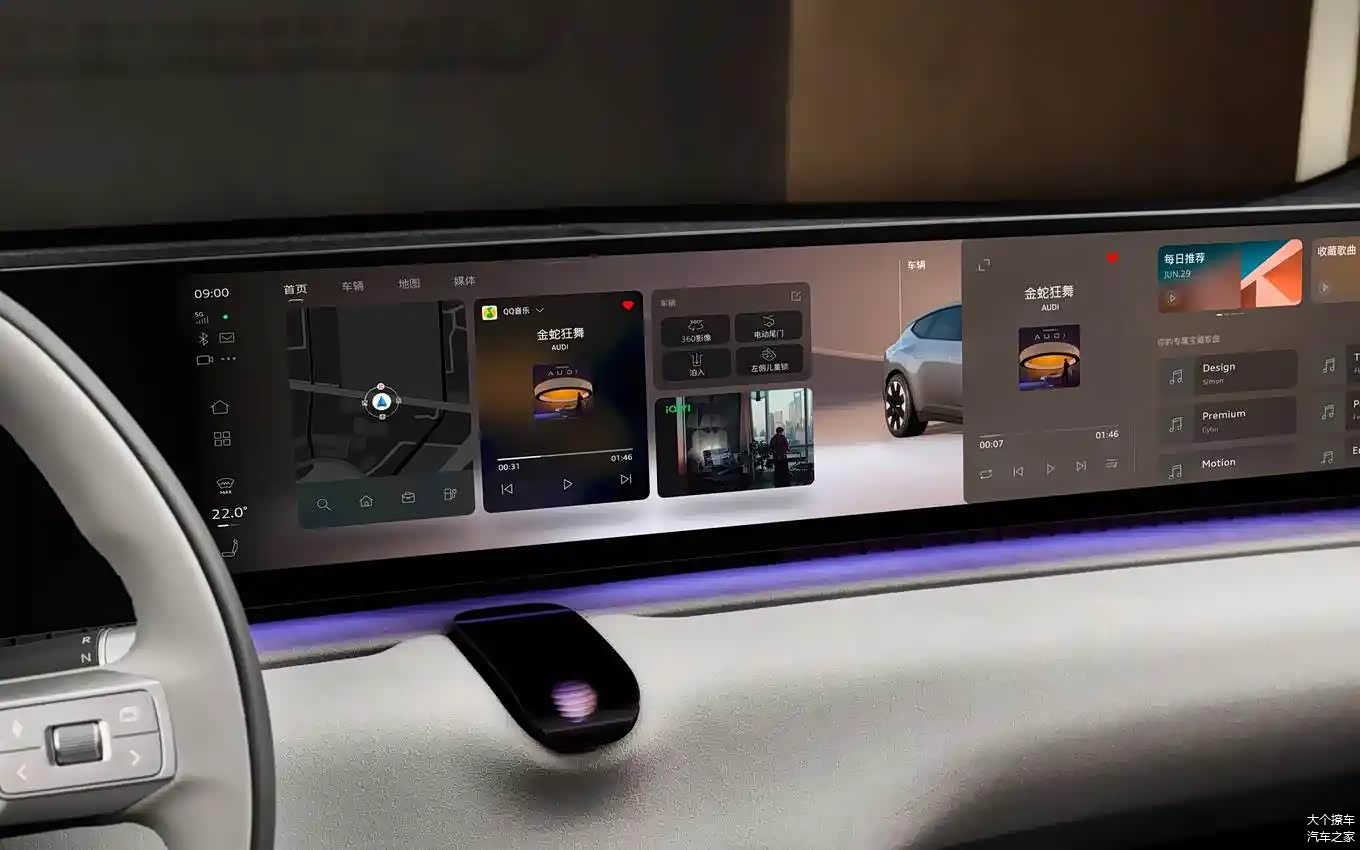在高通骁龙8295汽车芯片的支持下,AUDI OS操作系统为新车提供了出色的人机交互体验。59英寸的4K贯穿式超清广域屏是由两块Mini-LED显示屏组成的,并且其屏幕布局可以根据个人需求进行定制。车载系统内置了支持面部识别功能的应用商店,其内容丰富且功能与中国消费者的使用习惯高度匹配。