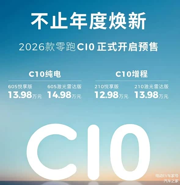 - C10纯电:605悦享版13.98万元,605激光雷达版14.98万元