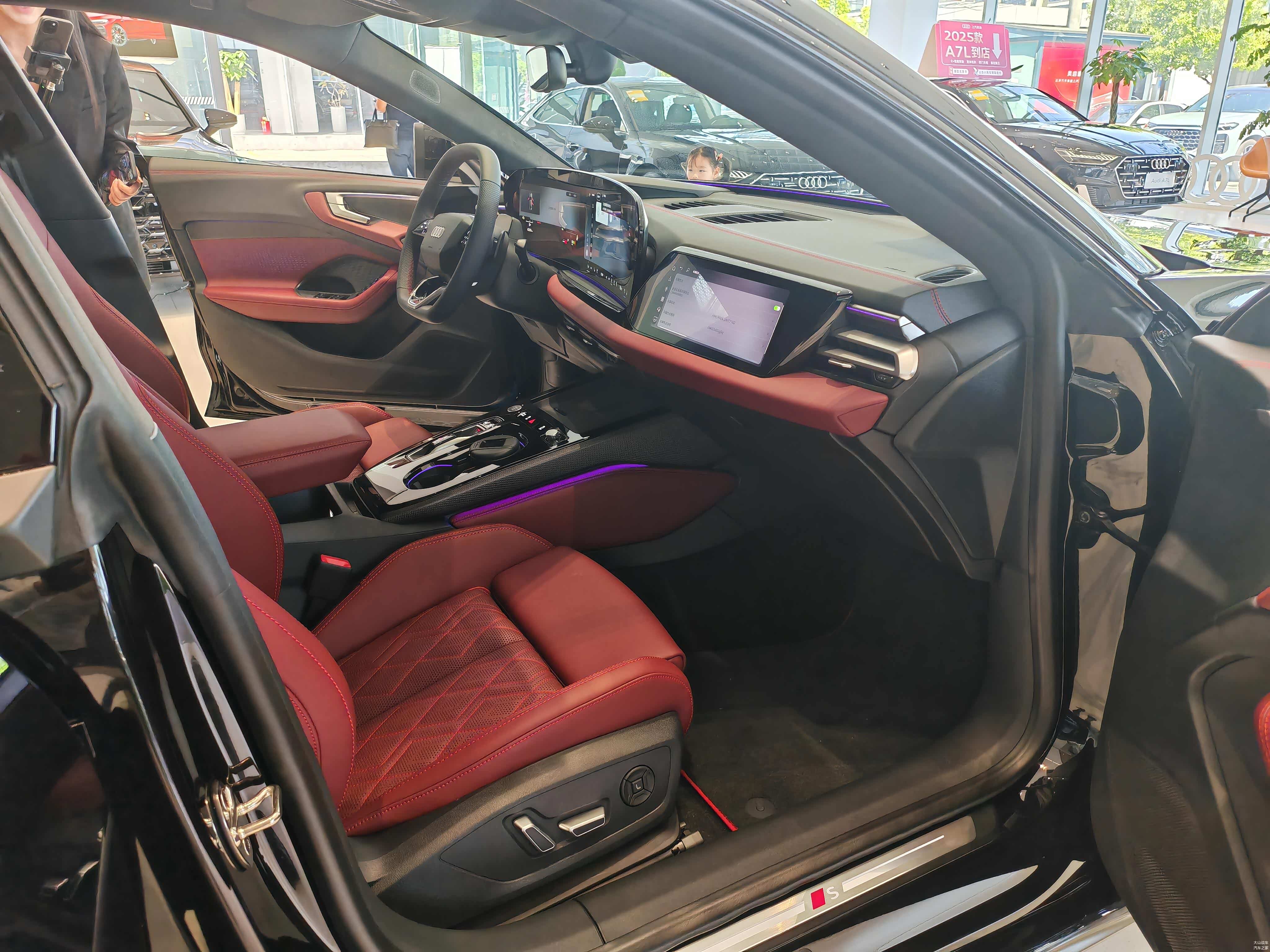 车身侧面是A5L的最大亮点之一,溜背式轿跑造型+无框车门的组合让整车显得极为动感,同时配备20英寸RS风格轮毂和红色刹车卡钳,进一步强化运动属性。尺寸方面,新车长宽高分别为4903/1883/1427(1447)mm,轴距2922mm,相比宝马3系(4838mm)和奔驰C级(4882mm)更具优势。