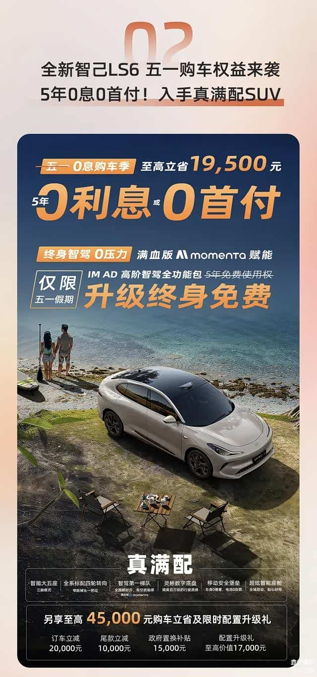 此外,智己汽车还公布了五一长假期间智己LS6的优惠政策,包含购车可享5年0利息或0首付贷款,IM AD高阶驾驶辅助全功能包升级为终身免费。另外可享至高45000元购车立省及限时配置升级礼,订车立减20000元,尾款立减10000元,政府置换补贴15000元,配置升级礼至高价值17000元。
