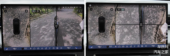 评测车配备了360度全景影像和透明底盘,并支持多角度查看,方便驾驶员查看车辆周边情况。影像清晰度较高,车辆周围的畸变控制合理,实用性达到同级别车型主流水平。