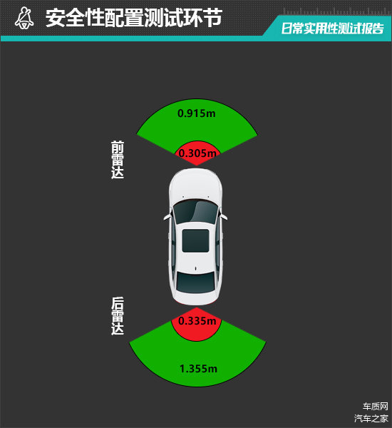 前雷达最远可以在0.915m处感应到前方物体,雷达功率表现一般;持续蜂鸣提示距离为0.305m,表现同样未达到同级别车型平均水平。