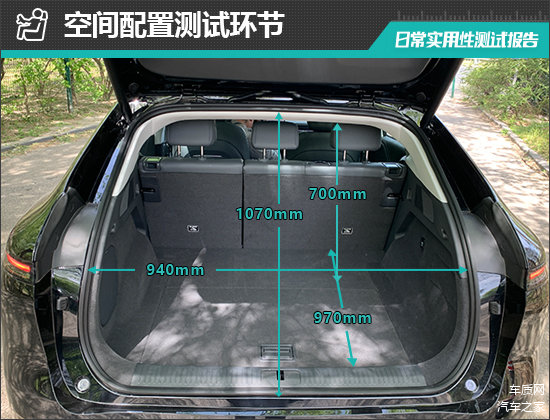 后备厢内部造型较为规整,地板平整度不错。后排座椅支持比例放倒,放倒后可以进一步拓展后备厢空间。对于评测车后备厢的基础数值,我们也进行了实测,开口长度为1070mm;开口宽度为940mm;后备厢进深为970mm;后备厢地台与顶部的垂直高度为700mm。