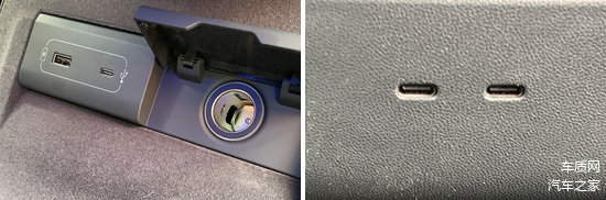 评测车配备1个USB Type-A接口和3个USB Type-C,接口兼容性较好。其中,前排1个USB Type-A接口和1个USB Type-C接口,位于中控台下方;后排2个USB Type-C接口位于空调出风口下方。此外,前排中控台下方还提供1个12V电源接口,能够满足车内乘客多种电子设备的用电需求。