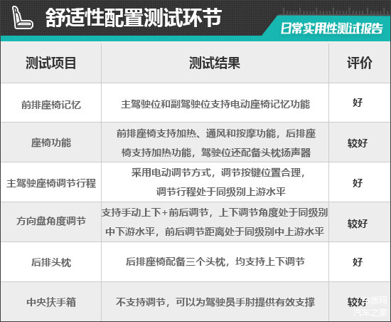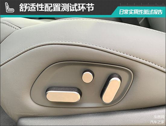 座椅方面,评测车主驾驶座椅电动调节按键位于座椅侧面,调节按键位置合理。此外,评测车前排座椅均支持记忆功能,并提供加热、通风和按摩功能;后排座椅提供加热功能;同时,驾驶位还配备头枕扬声器,舒适性配置较好。