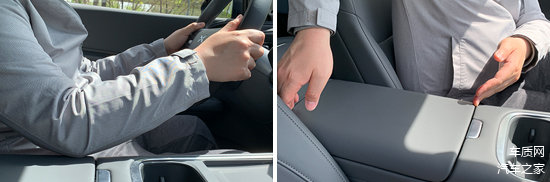 前排中央扶手采用上掀式设计,造型规整且尺寸较大,表面采用软性材质包裹,枕靠舒适性不错。虽然不支持前后移动和角度调节,但驾驶者在驾驶过程中,依然可以将肘部倚靠在上面。