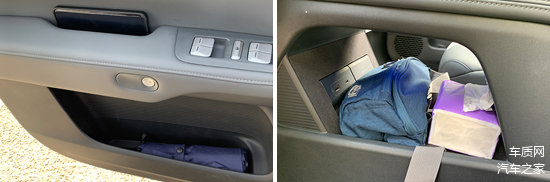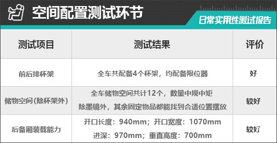 经过实测,除墨镜之外,其余固定物品均可以合理地放置在评测车前排各个储物空间内。中控台下方储物槽容积较大,可以满足消费者对空间的需求。需要指出的是,评测车前门板储物槽容积略小,有待进一步优化。