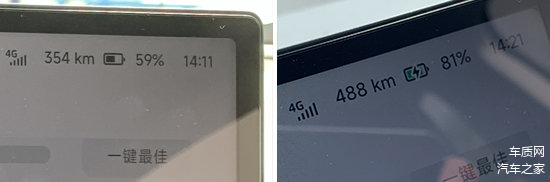 此外,对于充电效率我们也进行了测试。实测使用快充桩充电10分钟后(波峰用电),电量从59%充至81%,续航里程增加134km,与车辆电脑预计的用时基本吻合。