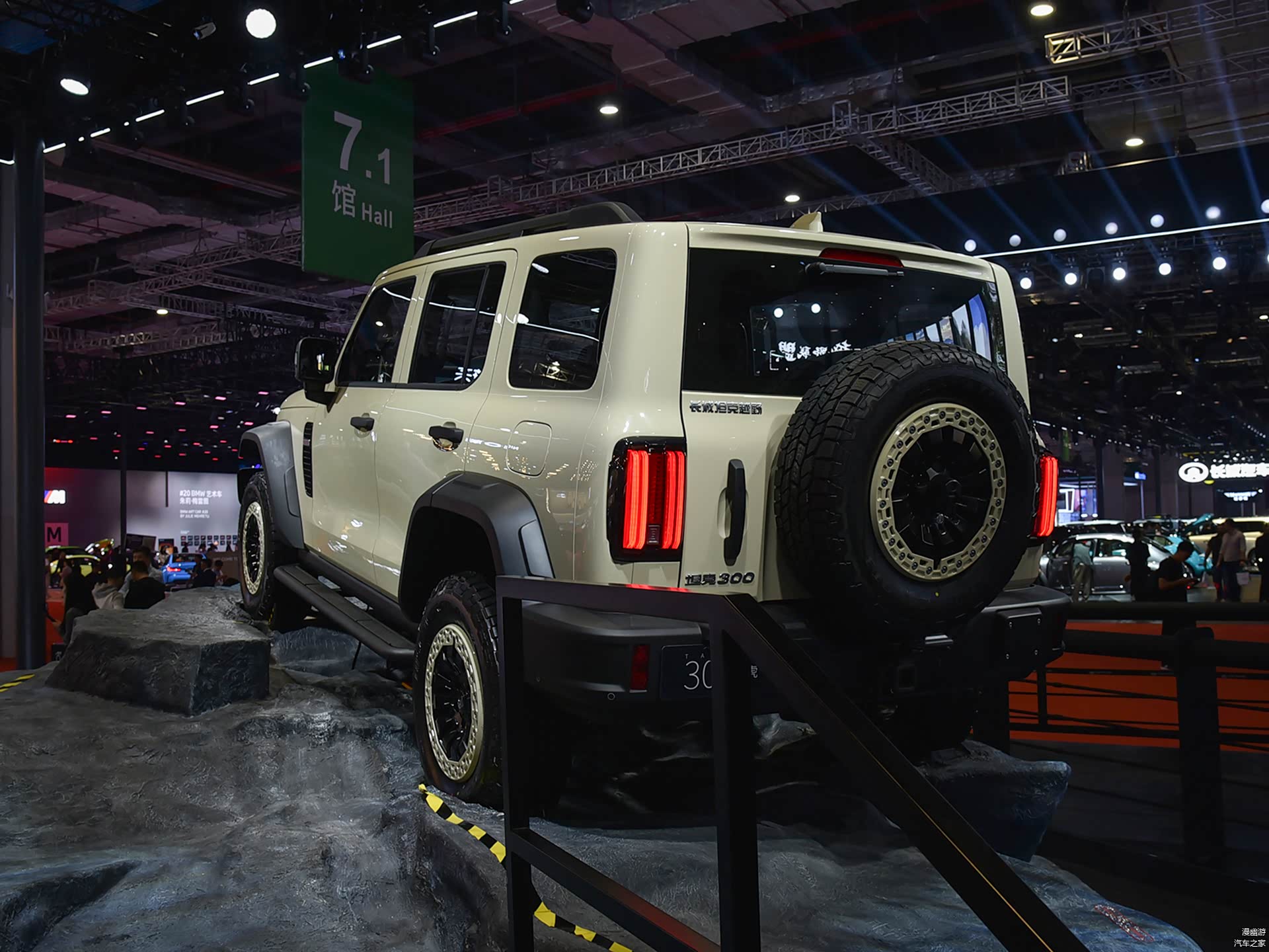 今年3月10上市的2025款坦克300在上海车展上带来了坦克300虎克版车型。该车型是长城与越野IP“虎克之路”的共创车型,不仅加装了越野套件,还将底盘前后均调整为整体桥的结构。外观方面,虎克版车型与常规版车型基本一致,前中网部分采用标志性的三根横向黑色饰条,两侧搭配圆形灯组,灯组内部各有一条横向日行灯。车辆的前后包围、轮眉、侧踏板处均突出于整体车身,前轮翼子板处加装了黑色饰板点缀。轮胎使用的是固铂Discover系列的全地形轮胎,匹配防脱轮圈。车尾部分配备背负式备胎,两侧的矩形尾灯采用分体式设计。
