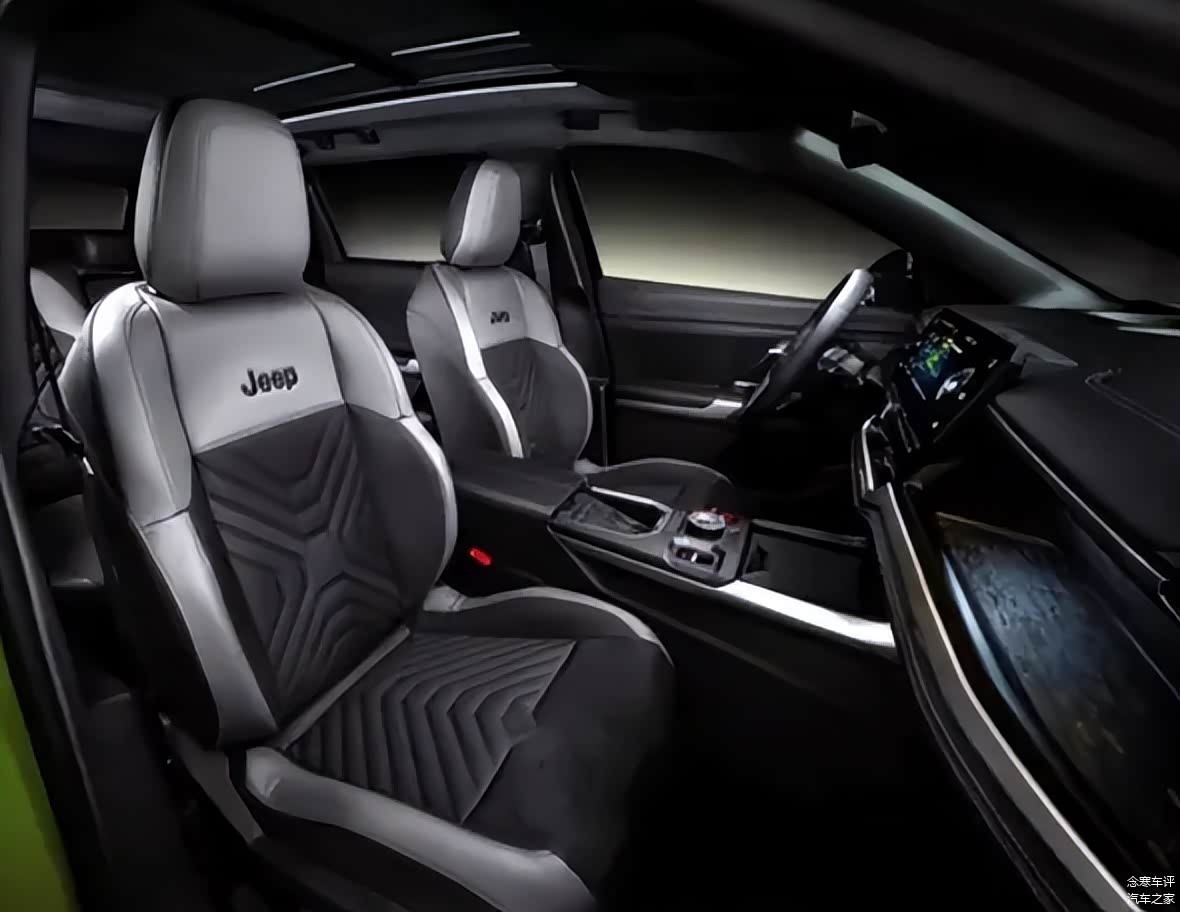 中控台用了木纹饰板、银色装饰条和亮色缝线,想提升点档次感。座椅是双拼色的,靠背上还有“Jeep”标识。