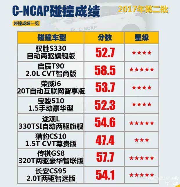 最近,2017年度C-NCAP第二批碰撞试验成绩正式公布。本次碰撞试验共有8款车型参加,其中4款车型获得了五星评价,具体碰撞成绩如下: