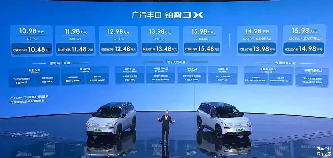 除了精准的卡位,还有一步到位的精准定价。铂智3X共推出7款车型,入门款低至10.98万元,补贴后价格低至10.48万元,10万级就能拥有丰田超严苛安全标准打造的智能纯电车型。智能驾驶辅助版本起售价14.98万,是14万级唯一带激光雷达的全场景智能驾驶辅助车型,补贴后价格更低至13.98万元起。