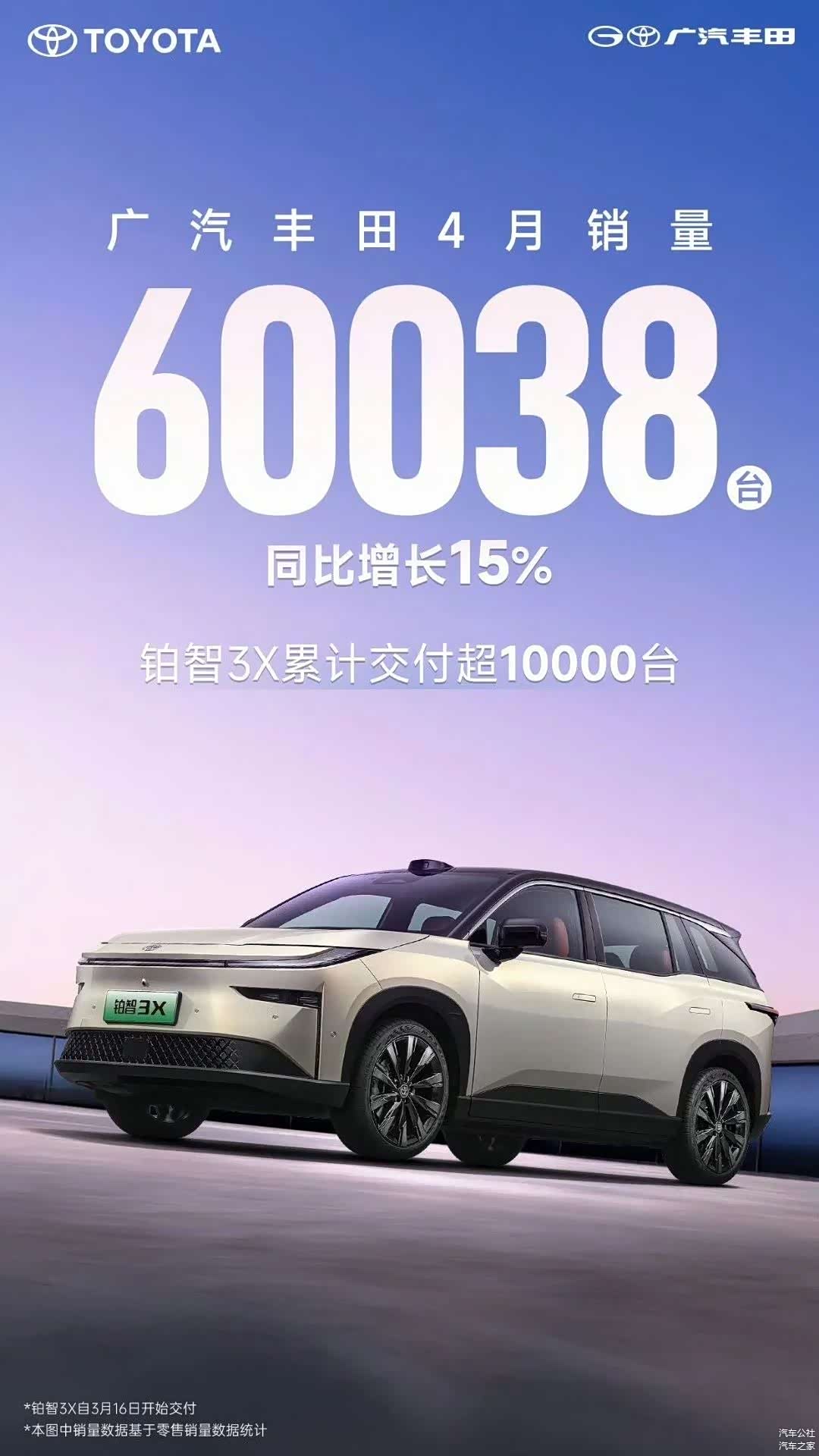 在铂智3X的强力推动之下,广汽丰田4月份销量强劲增长,5月1日晚上发布的数据显示,广汽丰田 4 月销量 60038 辆 ,同比增长 15%。在广汽丰田执行副总经理文大力看来,“铂智3X的热销有着必然性!”,但上市40天交付量实现1万辆有点出乎预料,也让广汽丰田的排产准备措手不及。