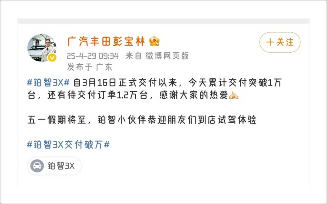 “自3月16日正式交付以来,今天累计交付突破1万台,还有待交付订单1.2万台,感谢大家的热爱!五一假期将至,铂智小伙伴恭迎朋友们到店试驾体验。”4月29日,广汽丰田副总经理彭宝林在微博上广而告之。