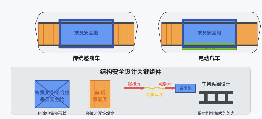无论是电动汽车还是传统燃油车,车辆结构安全的设计理念高度一致,都遵循“乘员舱生存空间+可溃缩吸能区”的原则。整车普遍采用高强度钢或铝合金打造乘员安全舱,确保在碰撞中不变形侵入,保护车内乘员。车头和车尾布置有吸能区,通过合理的纵梁和防撞梁设计,在碰撞时逐级塌缩、吸收能量。