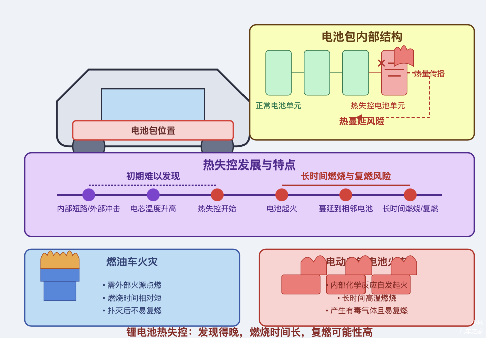 能量载体不同决定了两者火灾风险表现不同:燃油是易燃液体外泄,锂电是内部热失控。防护的手段可能不一样,但目标一致。