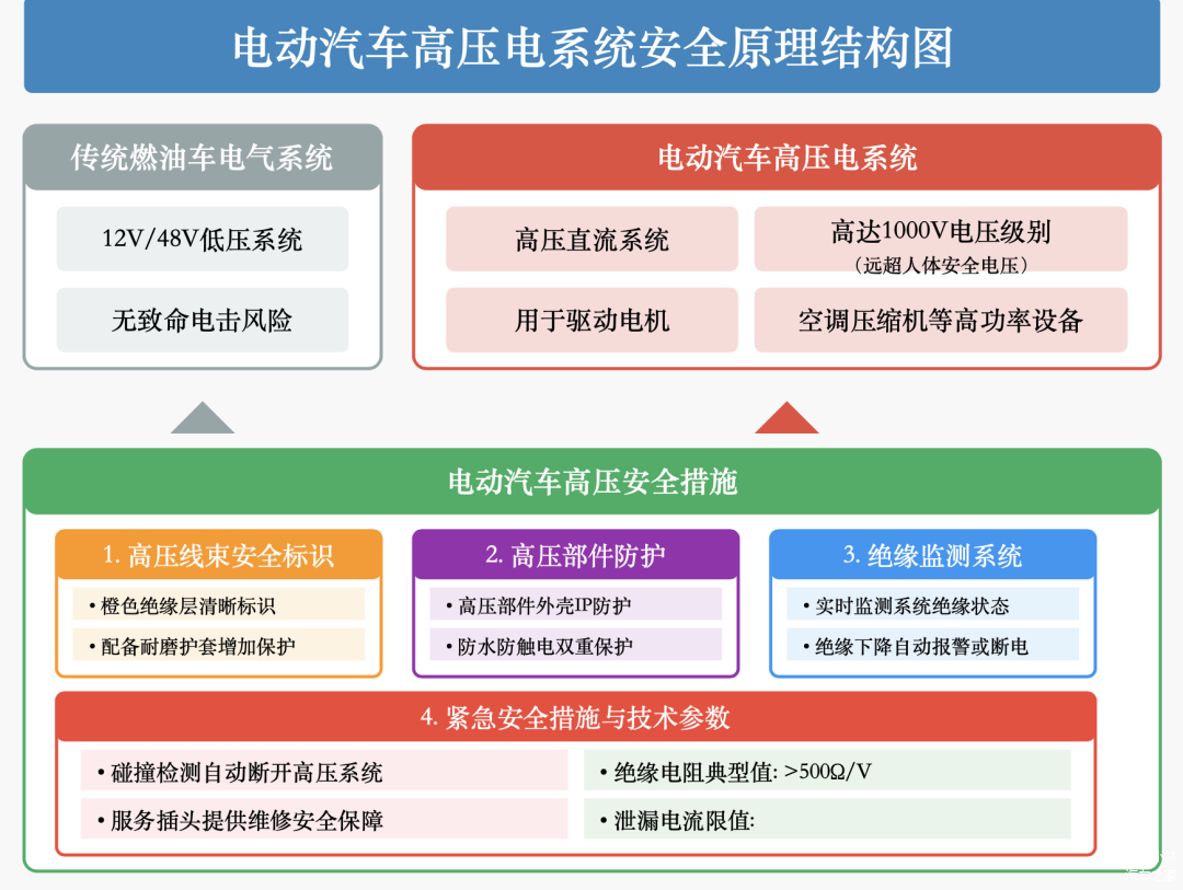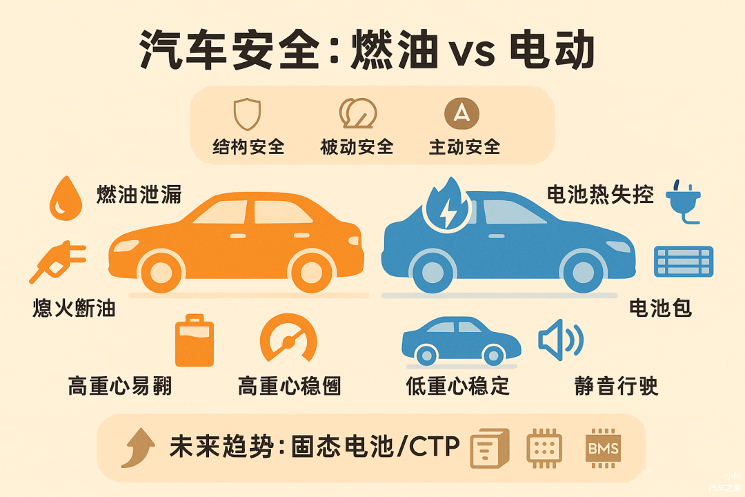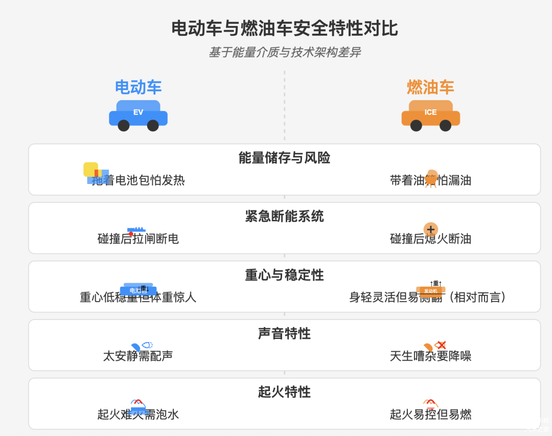 电动车与燃油车在安全上的本质差异主要围绕**“能量介质不同、因为技术架构不同”展开。概括几个对照组: