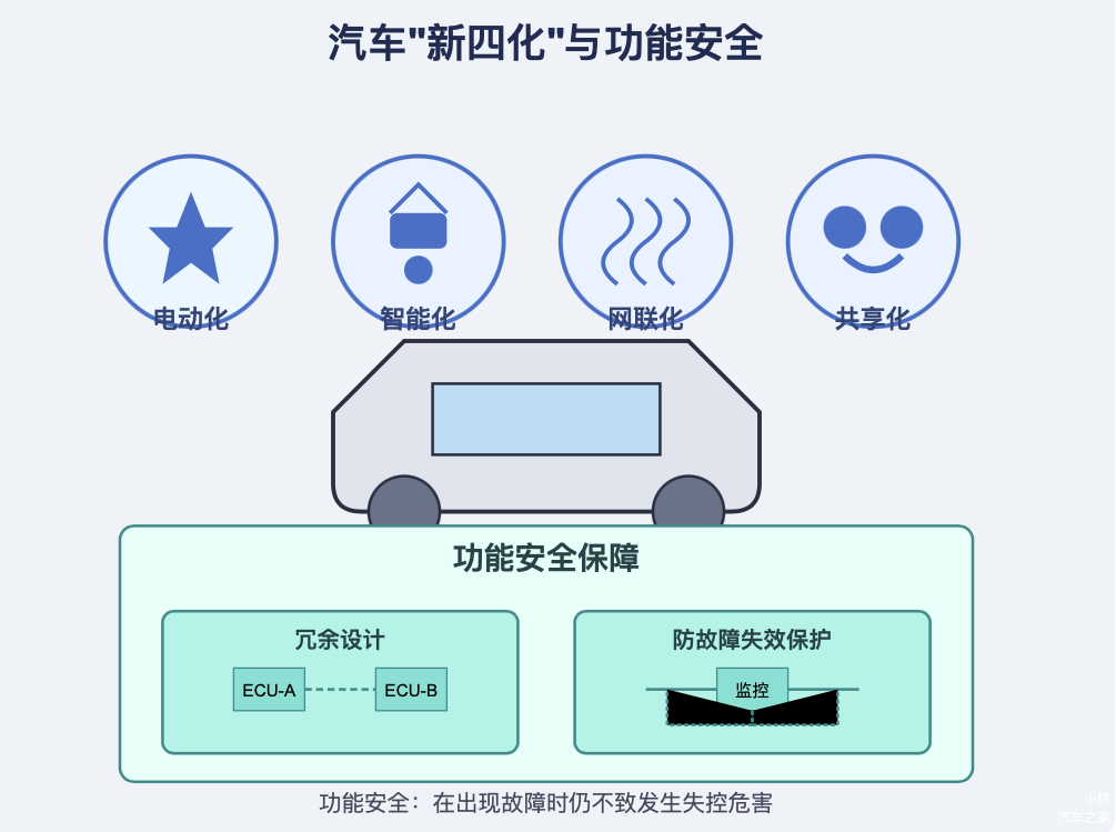 汽车“新四化”(电动化、智能化、网联化、共享化),电子电气系统越来越复杂。无论电动车还是燃油车,大量ECU芯片参与控制底盘、动力、转向、制动等关键功能,都必须保证功能安全——即在出现故障时仍不致发生失控危害。例如冗余设计、防故障失效保护等,以免因单点故障导致失控。