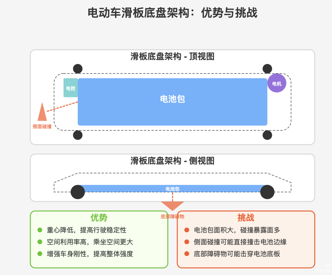 电动车的动力电池通常体积庞大且质量可占车辆整备质量的20-30%,布置位置深刻影响车辆设计。当前主流乘用电动车多采用平板状电池包安装在车底(即“滑板底盘”架构),这样做优点是重心降低、空间利用率高,并且电池包作为底盘结构件也能增强车身刚性。