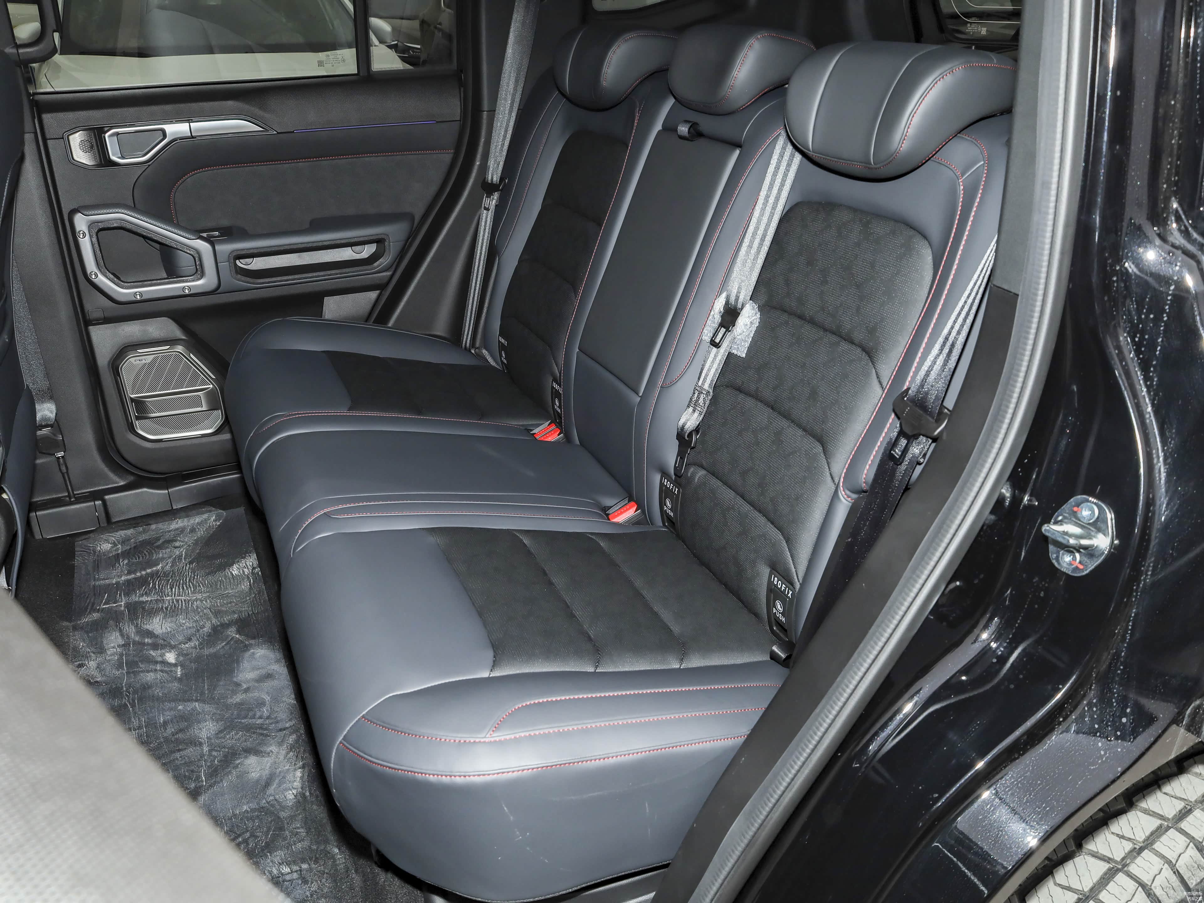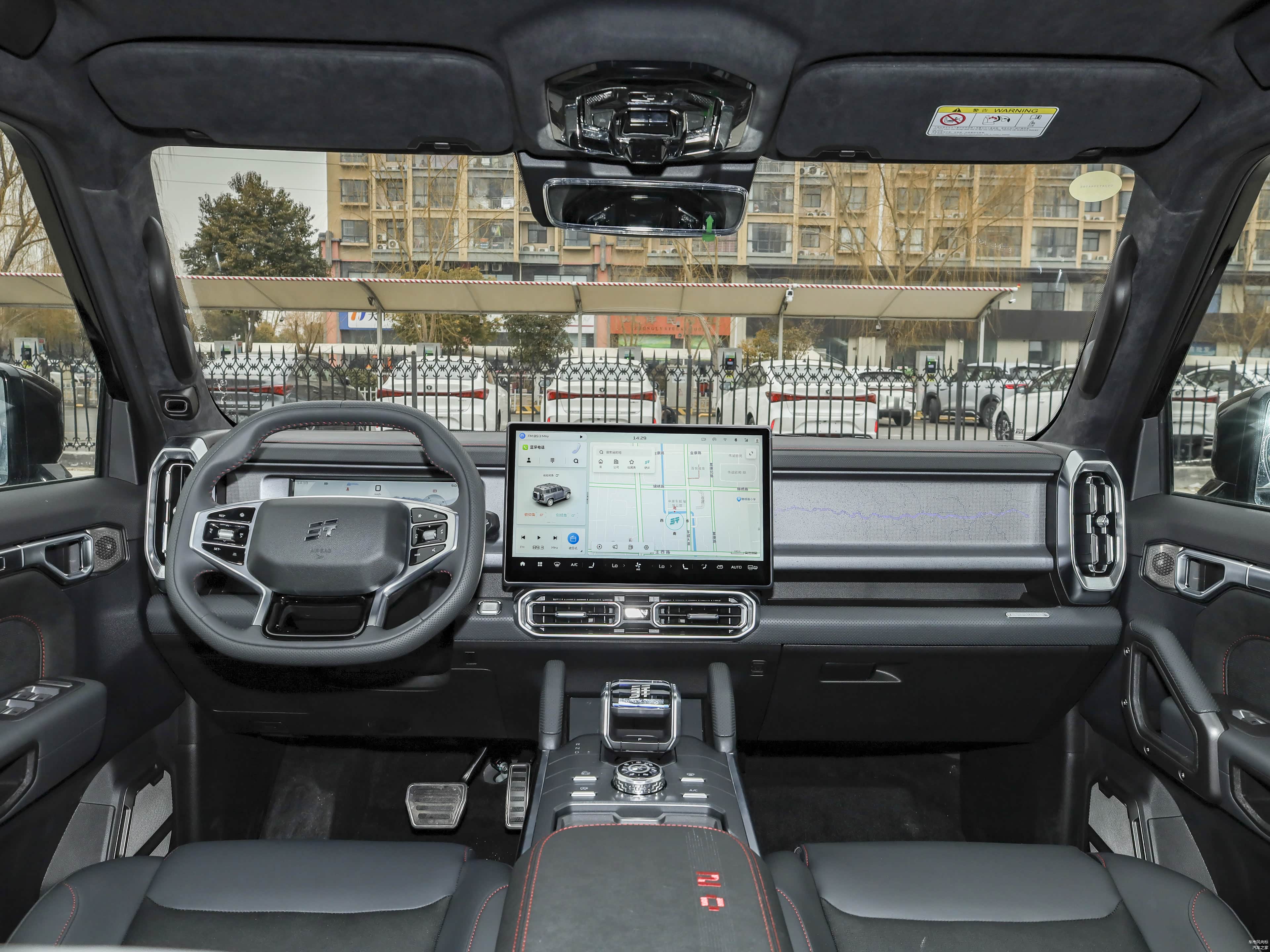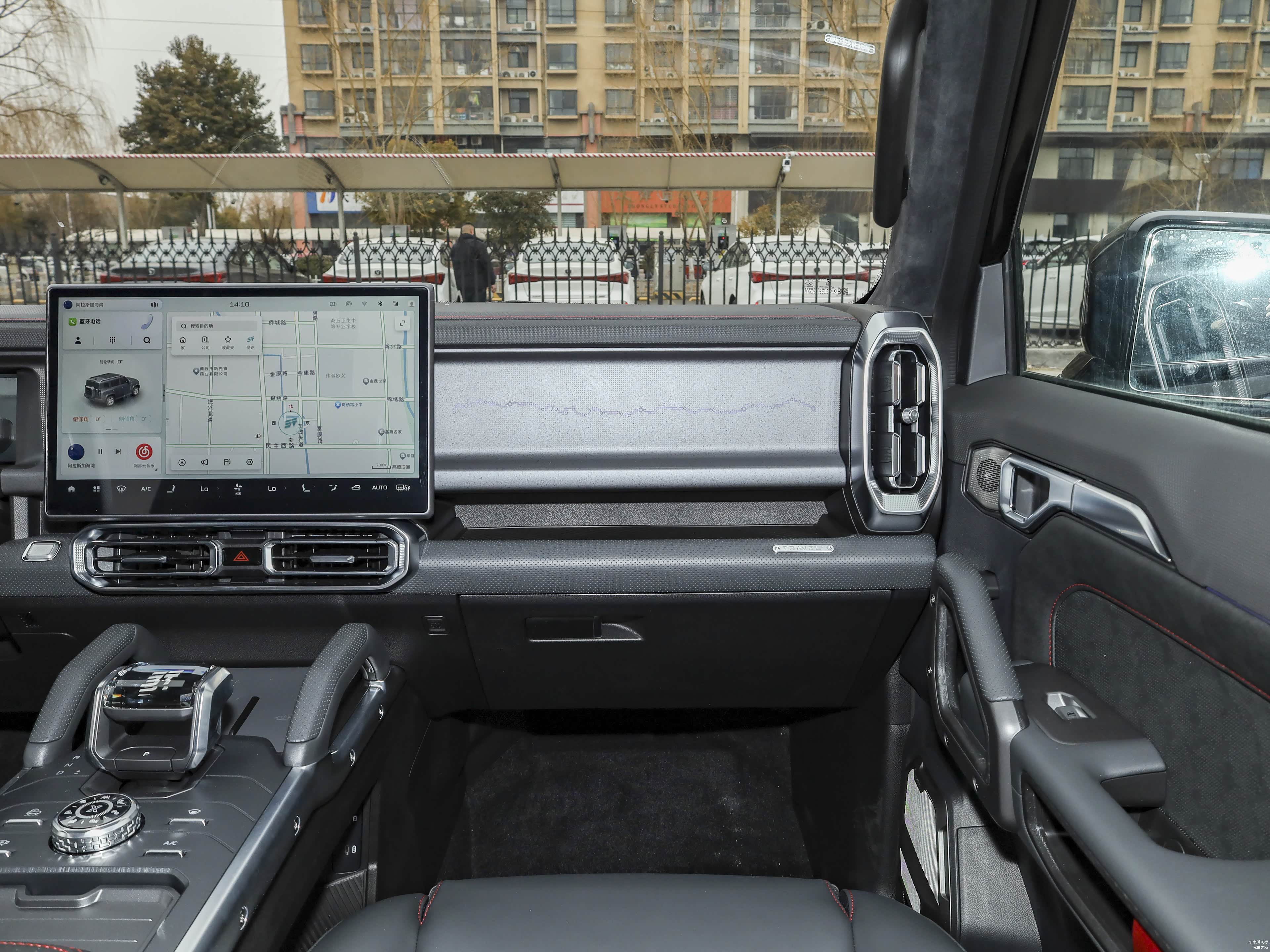 内饰升级聚焦于材质与交互体验的双重提升。中控台的造型还是T型样式,线条硬朗,符合其定位,车内保留了不少物理按键和旋钮,便于户外穿行时控制车辆。车内空调出风口由亮面电镀改为哑光电镀工艺,副驾前方饰板内嵌的318国道路线图新增动态氛围灯,可随音乐律动变换光影,夜间行车时营造出独特的仪式感。座椅采用皮质与麂皮混搭材质,主驾驶位支持10向电动调节与气动按摩功能,配合前排双层夹胶玻璃与12扬声器SONY音响系统,整车的NVH性能得到提升,即便是方盒子车型,风噪也被抑制的很好,另外通过主动降噪技术,有效降低车内的低频噪音。