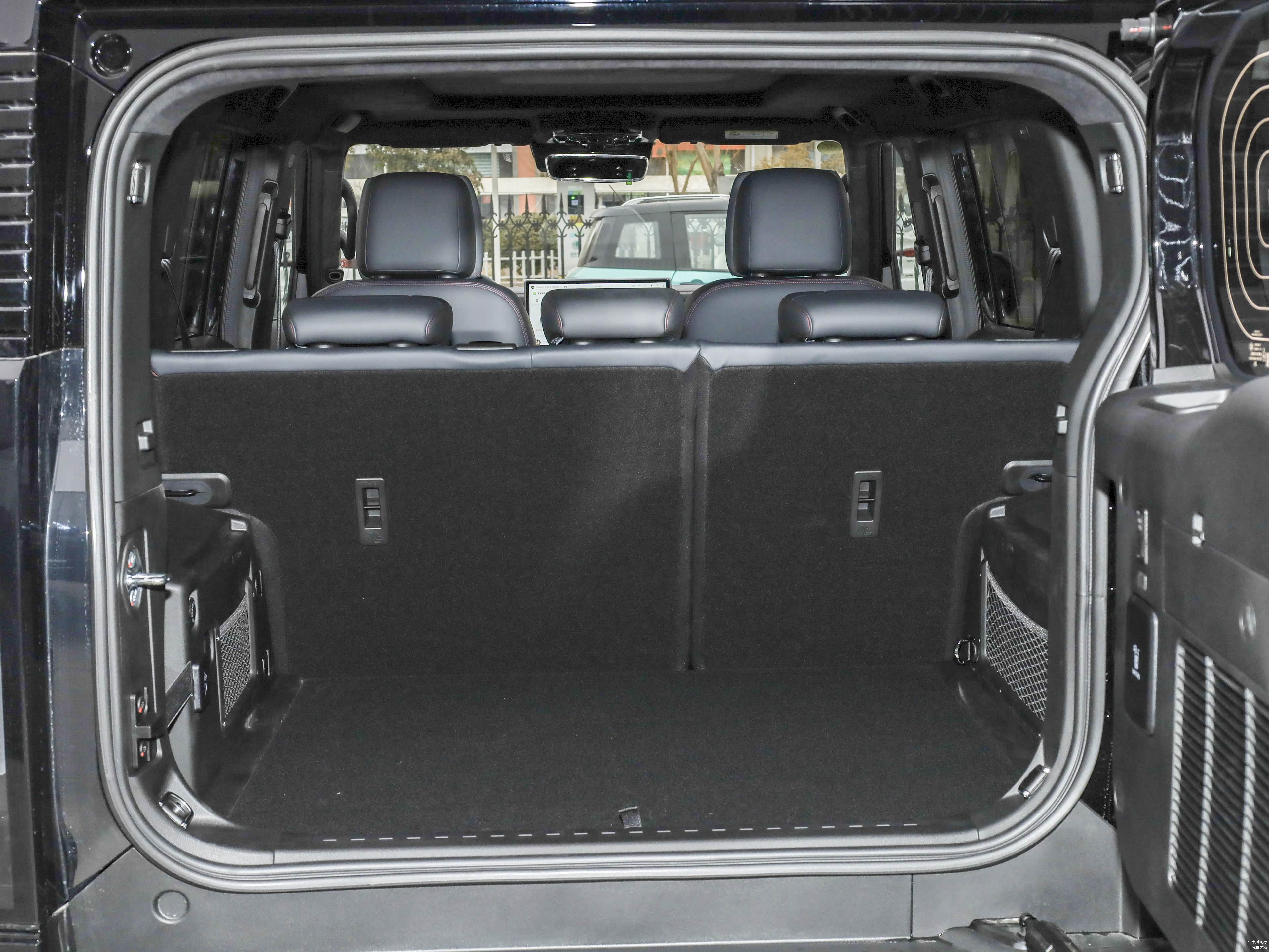 侧面方正硬朗,前后轮拱外凸,配合塑料包围,增加户外野性,车顶线条平直,对后排乘坐空间友好,A/B/C/D柱等都是采用隐藏式设计,营造出悬浮式车顶的效果,车辆配备常规门把手和19/20英寸五辐式轮毂,车尾上窄下宽,尾灯组竖式布局,尾部保留外挂式备胎设计,配备的是非全尺寸备胎,外罩备胎罩,既延续越野传统,又规避备胎外露带来的风噪问题。