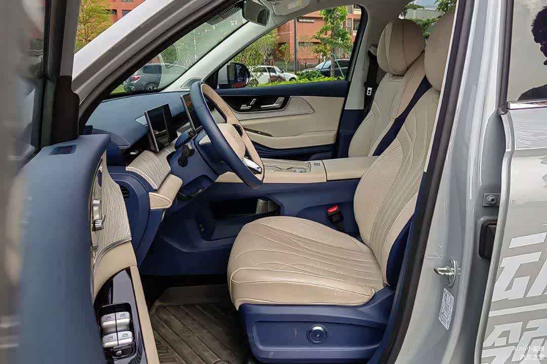 前排座椅配备了3档通风、加热以及10点气袋按摩,其中主驾支持6向调节+4向腰托调节,座椅电动调节按键设置在门板上,副驾可实现一键女王舒躺,坐垫腿托最大开启角度可达128°,坐垫靠背最大开启角度高达125°。