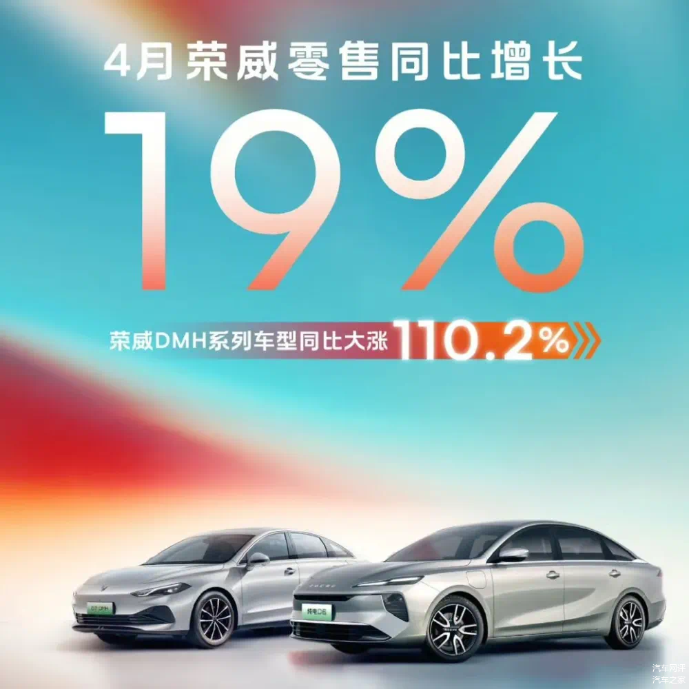 上汽的改革成效与经营韧性仍在延续。4月份,荣威、MG零售6.8万辆,其中荣威零售同比增长19%,DMH混动系列更是凭借43%的高热效率及低油耗,实现销量翻倍,同比大涨110.2%。