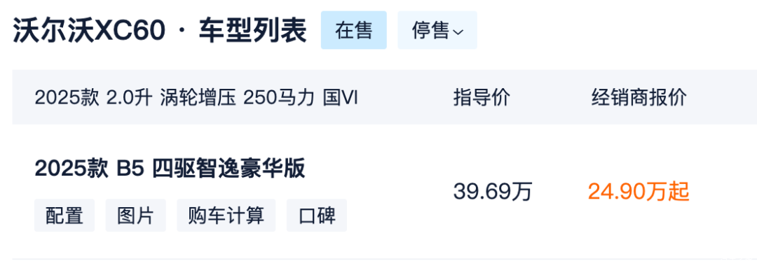 从目前的终端优惠来看,指导价39.69万元的沃尔沃XC60。经销商报价已经低至24.90万元,按照正常逻辑,实际到店大概率还能再谈。要是再算上各种补贴政策,价格还会再降。从全国范围内的情况来看,沃尔沃XC60裸车价落在25万以内,基本都没太大问题。