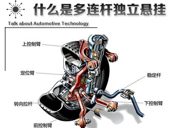 多连杆独立悬挂超过三个以上,比如四个五个甚至更多。多连杆是最复杂的一种悬挂结构,多用在后轮。结构相对复杂,材料成本、研发实验成本以及制造成本比其它类型的悬架还要高、而且其占用空间大,中小型车出于成本和空间考虑极少使用这种悬架。多连杆悬架的绝佳搭档:高档轿车