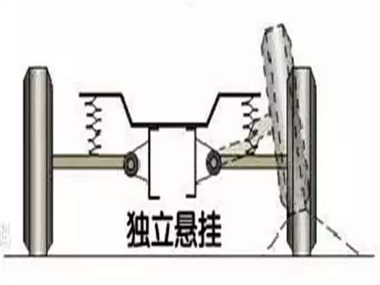 独立悬挂:每一侧的车轮都是单独地通过独立的悬挂装置与车体相连,当一边车轮发生跳动时,另一边车轮不受波及,汽车的平稳性和舒适性好。就意味着可以各自独立地上下跳动