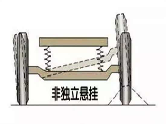 非独立悬挂:一侧车轮的弹跳会影响到另一侧,让另一侧也弹跳,因为左右两侧车轮之间是由一个刚性件链接起来,所以不能上下跳动