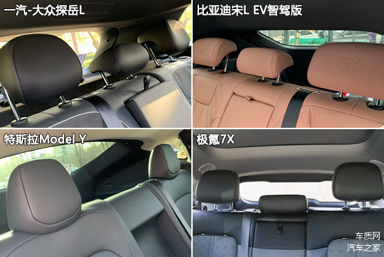 车内舒适性方面,四款车型均采用5座布局,除特斯拉Model Y之外,另外三款车型的每张座椅均配备了头枕。让人略感遗憾的是,一汽-大众探岳L和极氪7X虽然配备了后排中央头枕,但面积要小于两侧头枕,枕靠舒适性会受一些影响。
